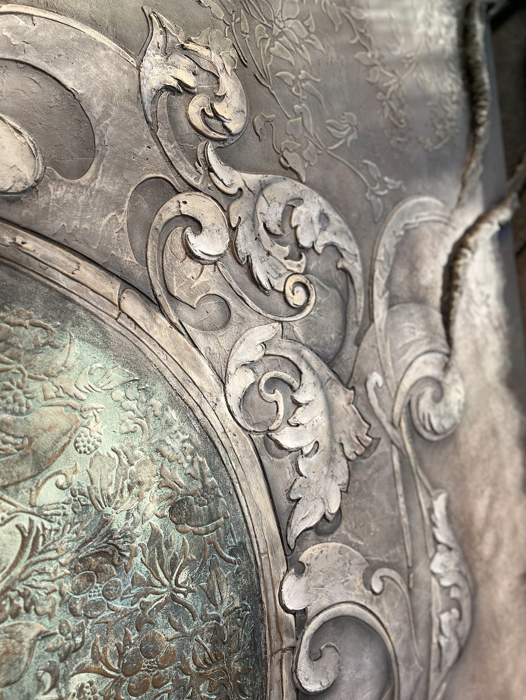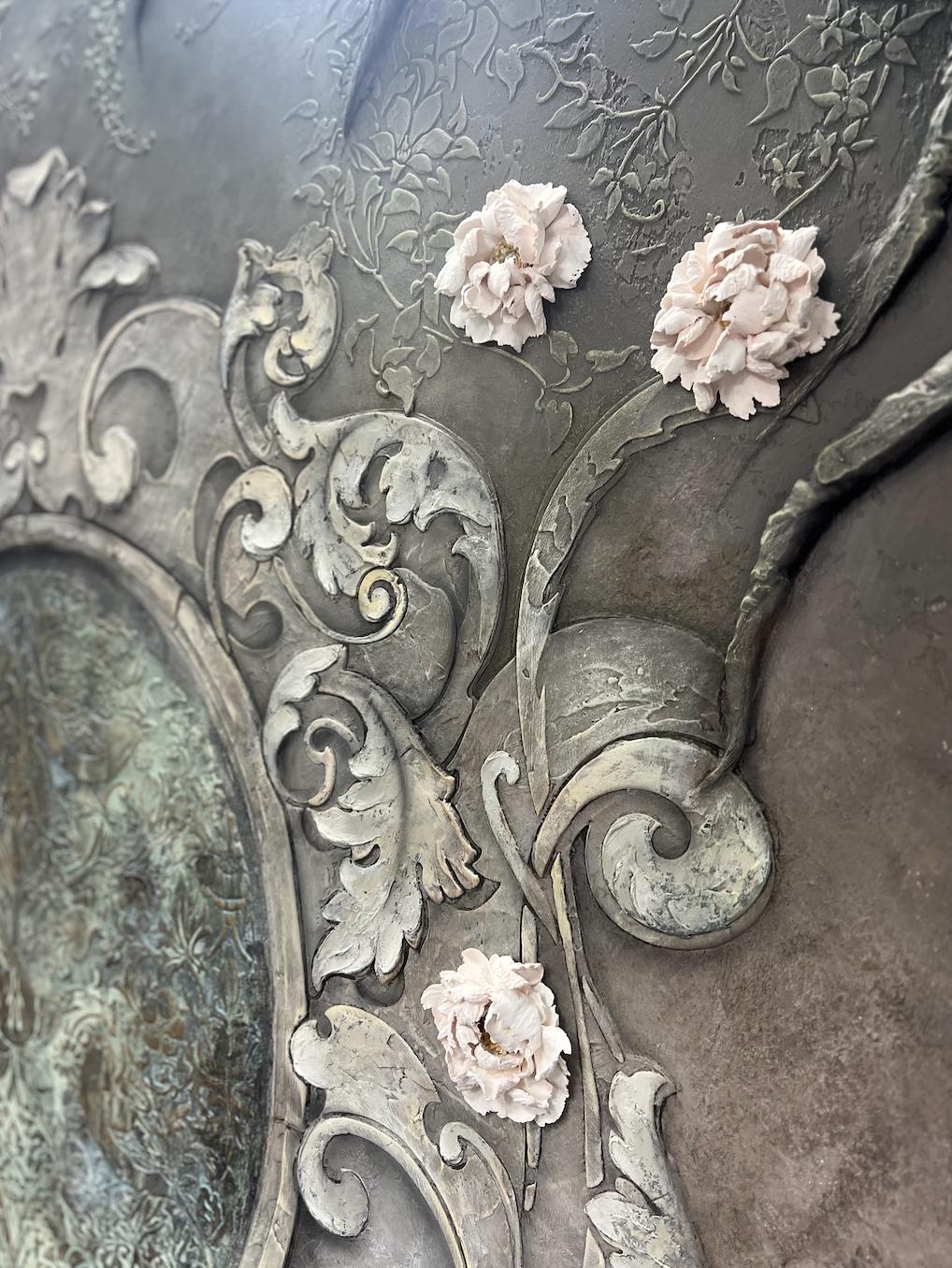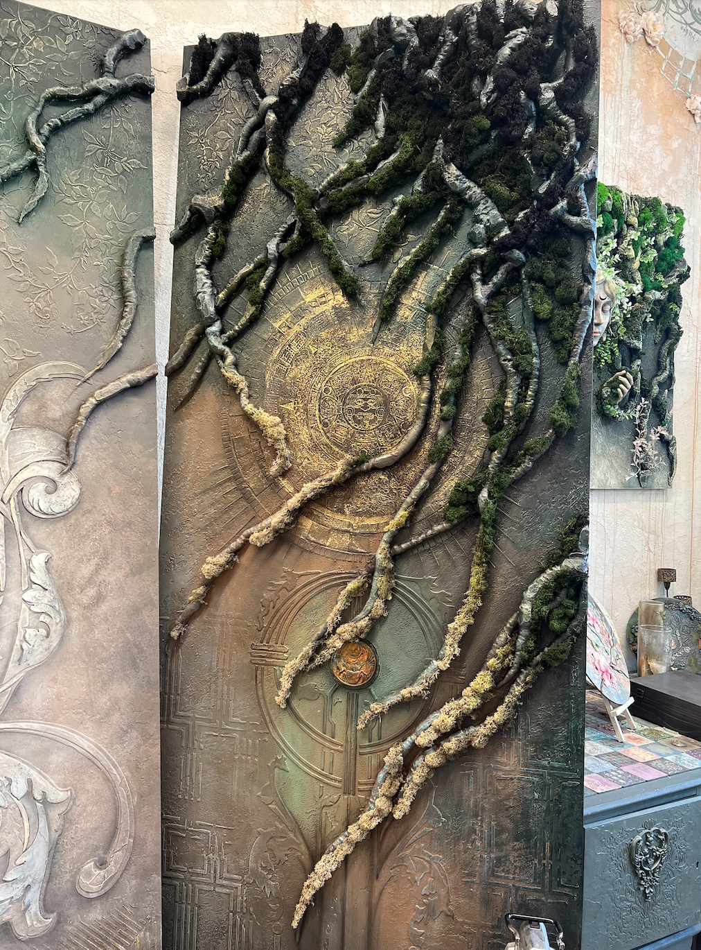 Так же хотим показать наш красивый стенд, который помимо образцов состоял из 4х панелей 95х245см в разных стилизациях от темного к светлому монохрому так же с этническими и классическими нотками в современном подходе по декоративным покрытиям, где мы применили наши уникальные многослойные трафареты и добавили барельеф, мох-ягель, трансферы, аэрографию, декоративные накладки и интерьерные часы так же нашего производства.