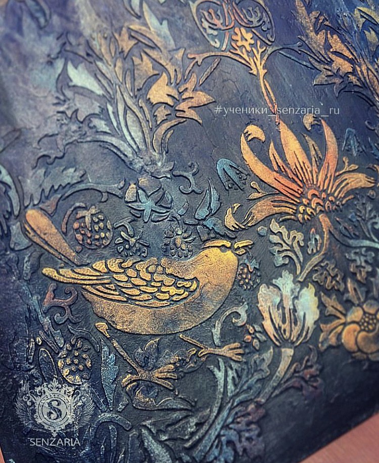 Волшебный по своей красоте трафарет, такие мельчайшие детали! Любой неказистый предмет с этим трафаретом будет выглядеть восхитительно! У меня пока не хватает умения работать с такой красотой, и трафарет немного получился смазанным, но, как ни странно, этому трафарету ничего не страшно! В смазанном виде эффект получился более винтажным! Мне очень понравилось!