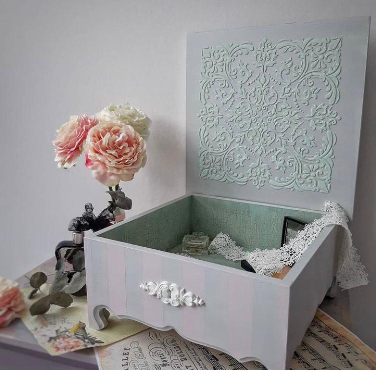 Обожаю этот трафарет..) Красивый рисунок. Прекрасно смотрится на крышке короба. Прошел со мной несколько мастер-классов, в том числе и детские. До сих пор цел и невредим. Очень практично. Однозначно рекомендую!